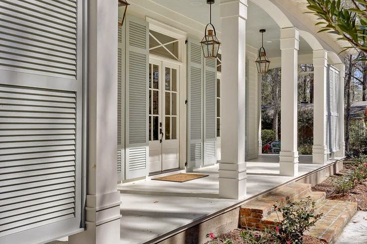 I love this porch.  I want blue bead-board ceilings, transom windows above all my windows, French doors, farm lights,  and a huge farmhouse table for lots of entertaining.