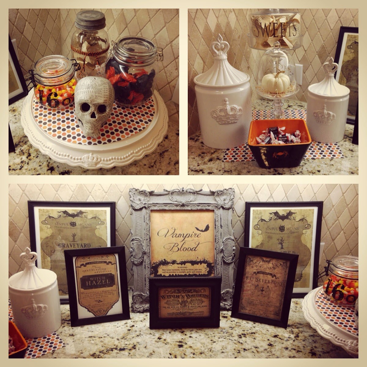 I already had the canisters, on the left, the cake stand, black spider bowl and jars on the cake stand so there was no expense there.