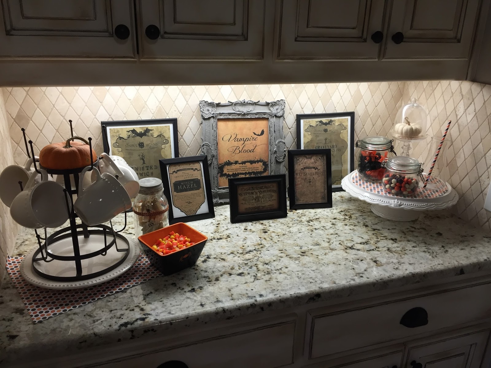 I turned our Butler’s Pantry into a Potion/candy bar.  Avery loves this every year.  Click HERE to get details on how to get this look!
