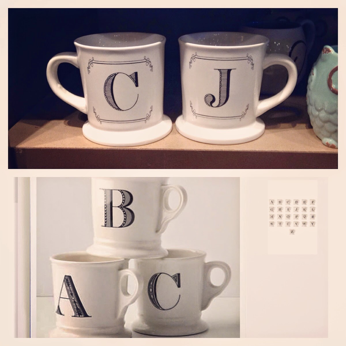I have always LOVED the monogram coffee mugs from Anthropologie (bottom cups in photo). They are $8 each. Kirklands has some (top photo) that are very similar that are ON SALE for $2.98