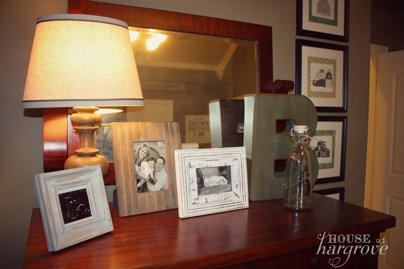 I got the lamp at Target and the frames & accessories are from Home Goods. One frame is Braden’s sonogram, one is of baby Avery and one is of his family…ready to meet him!