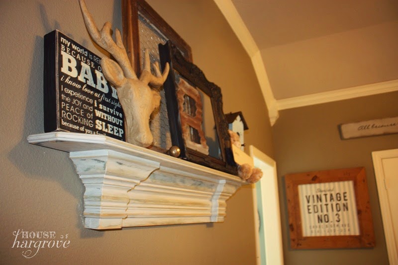 I changed the ribbon on these drapes but they are the same ones from Avery’s nursery. I used an old piece of barn wood at the top to finish it off. The pillows are from various places.