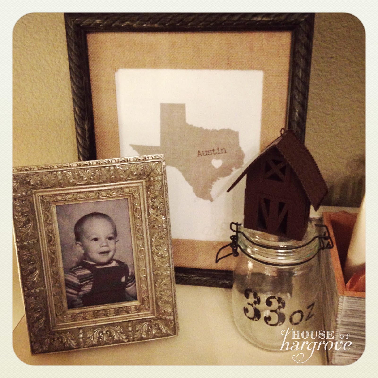 Here is a picture of Geoff when he was a baby, Braden’s middle name is Austin…(he is named after my favorite city) so I made this art for this room. The barn is an ornament from Garden Ridge for $3.99.