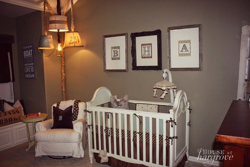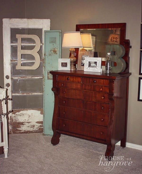 I got the barn wood frames at Hobby Lobby and made my own monogram art from my computer. I placed them on scrapbook paper from Hobby Lobby.